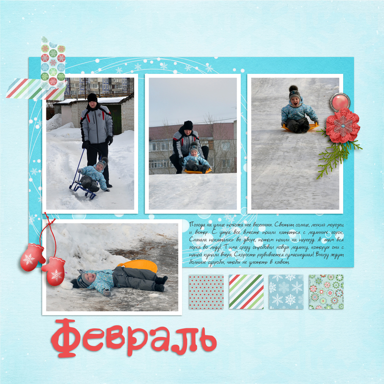 Синий разворот особенно нравиться и снег с фотки. Из критики на первом развороте цветок и бантик вместе плохо смотряться не естественно из-за теней, лучше убери бантик или отодвинь.