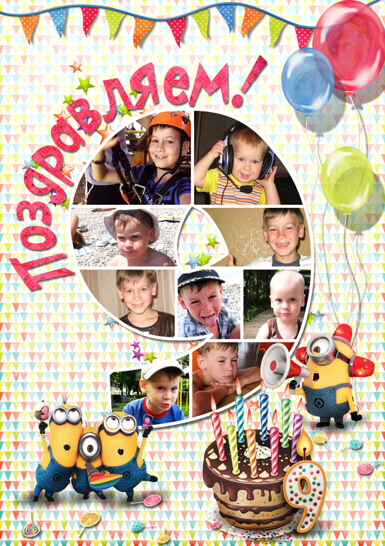 Законченные проекты (Скрап-альбомы, календари и пр.)Традиционные гирлянды поднадоели, сделала сыну вот такой плакат-открытку. Миньоны, куда ж без них