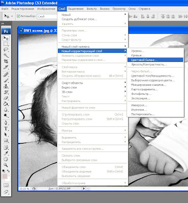 2. Далее создайте корректирующий слой, на котором будет вестись работа: СЛОИ (Layer) -> НОВЫЙ КОРРЕКТИРУЮЩИЙ СЛОЙ (New Adjustment Layer) -> ЦВЕТОВОЙ БАЛАНС (Color Balance)