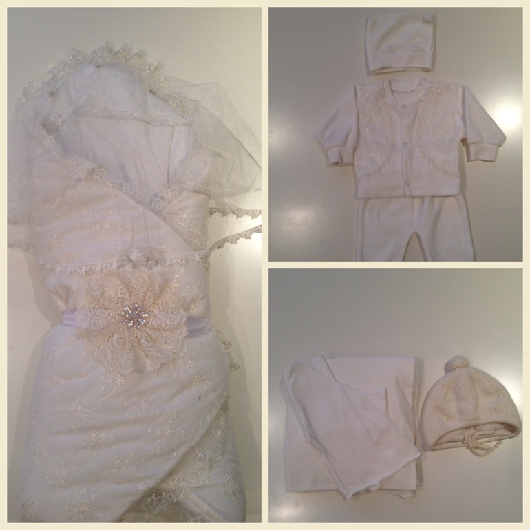 Очень красивый комплект на выписку, шикарное одеяло с вуалью и брошью, 2 теплые трикотажные пеленки, трикотажная распашонка, велюровый костюмчик: штанишки, кофточка, шапочка! В подарок теплая шапка + почта