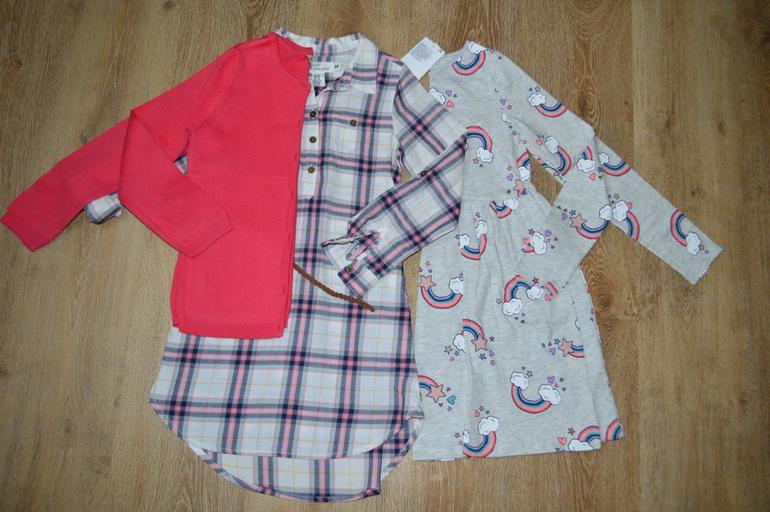Продам пакетом новые вещи на рост 122-128: платье с длинным рукавом НМ интересный принт с радугой, платье-рубашка НМ- смотрится очень стильно и в тон к платьям кофточка вайкики, все три вещи за 1500р. г.Саранск почта