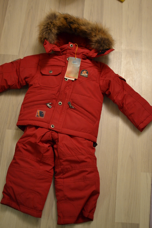 Удобный, теплый комбинезон для мальчика. Мех капюшона - натуральный.
