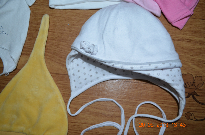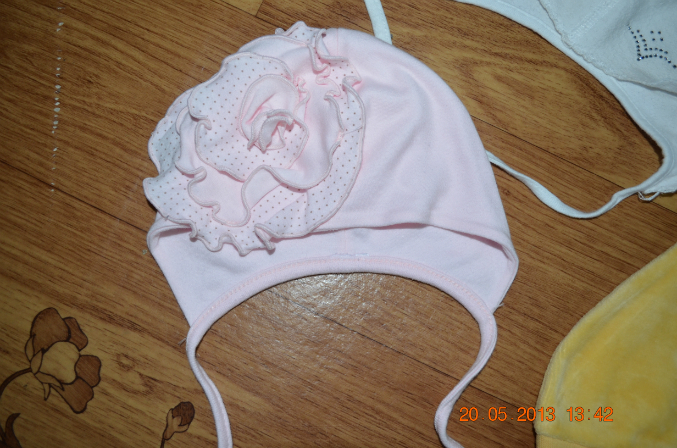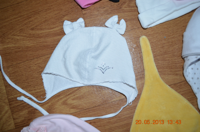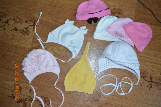 шапочки справа роз с черным, белая, св. роз и розовая на 0-3 мес по 50 р, желтая 100р, роз с цветком 3м новая 450р, бел с бантиками 3м 300р, белая с горохом 2-4 м 300р