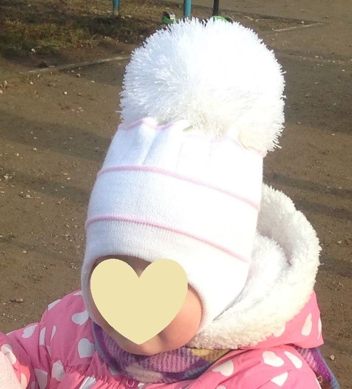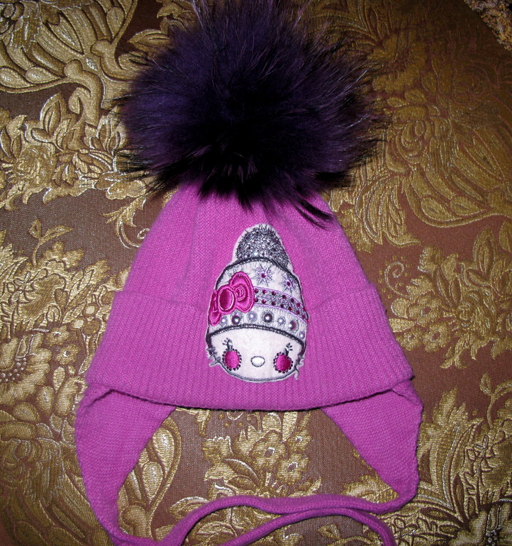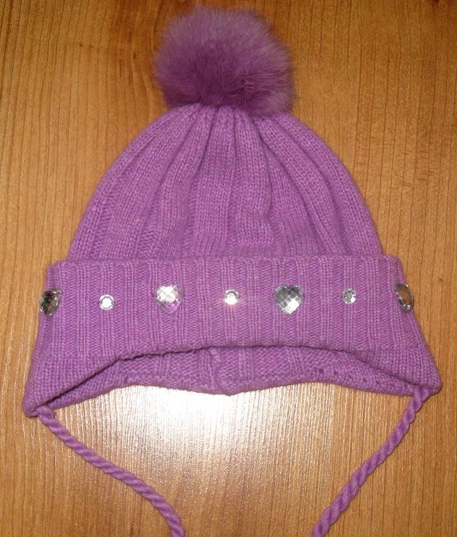 Теплая шапка размер 46 см. Украшена стразами и помпоном из натурального меха. Цена 300 рублей.