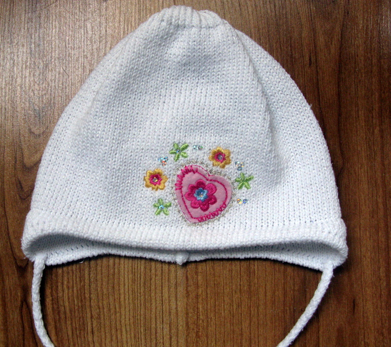 4. Шапка белая с розовым вязаным цветком и стразами б/у пару раз в идеале. Размер 46-48 см. Цена 250 рублей