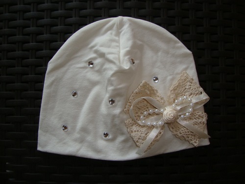 Новая, трикотажная шапочка (двойная и очень легкая) молочного цвета с ажурным бантиком.На ОГ 48-50.Цена 450р.ПРОДАНА