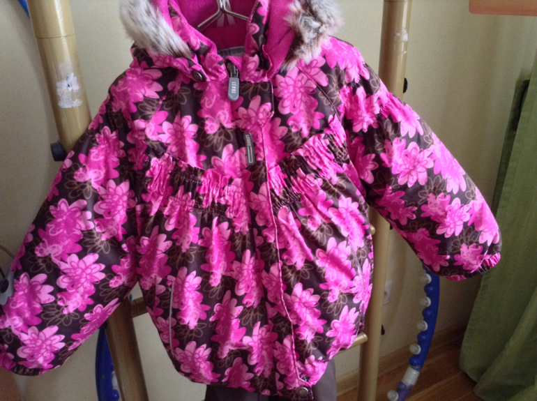 Девочка 4 года(98-104 см.)Очень теплый, ткань актив-непрмокаемая(неубиваемая). В куртке 330 гр, комбинезон 150. Состояние идеальное.