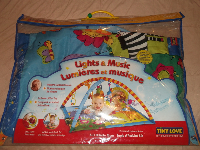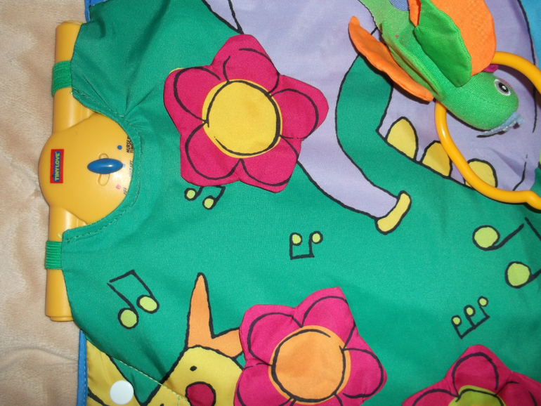 Оформлен двумя мягкими арками для игрушек. В игровой комплекс входят 5 тканевых игрушек: жираф, обезьянка, «дрожащий» слоник, попугай с шуршащими крыльями, погремушка-прорезыватель, большое безопасное зеркало (пластик) в мягкой оправе, которое крепится на липучках к дуге, музыкальная панель-цветочки (Моцарт) с бегающей подсветкой, очень интересно смотрится вечером. Работает от двух батареек АА (в комплекте).