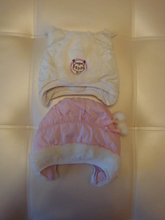 В комплекте предлагаю две очаровательные зимние шапочки, размер 46. Они прекрасно дополняют этот комбинезон и ребенок выглядит в них как "куколка". Отдам обе за 500 руб.