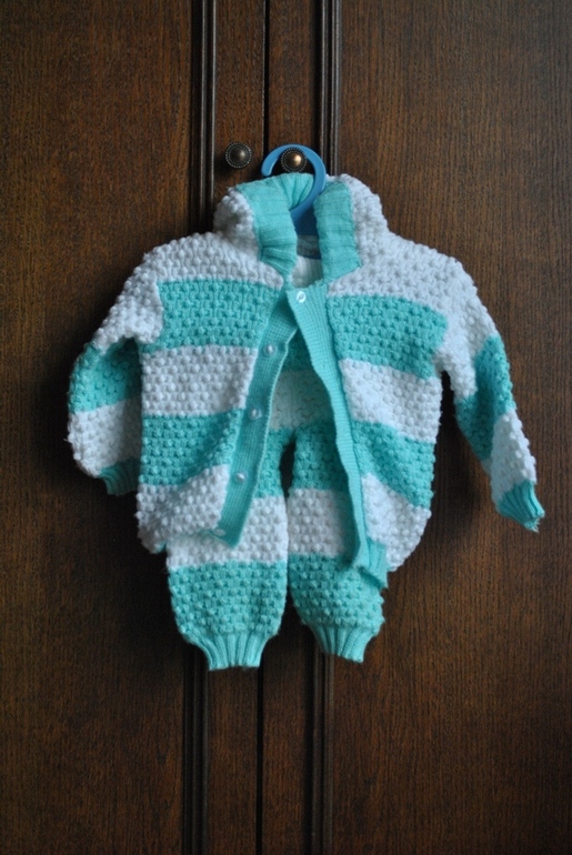 Бело-бирюзовый комплект - с капюшоном (мы надевали в 5 мес), 300р: