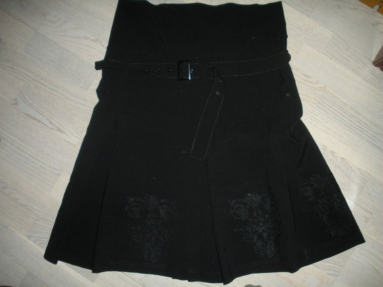 Юбка черного цвета р 46-48 состав 55% хлопок, 28% полиэстер, 10% вискоза, 7% эластан. Юбка снизу украшена вышивкой и мельчайшими переливающимися кристалами. Есть ремень под животик. Цена 200 руб.