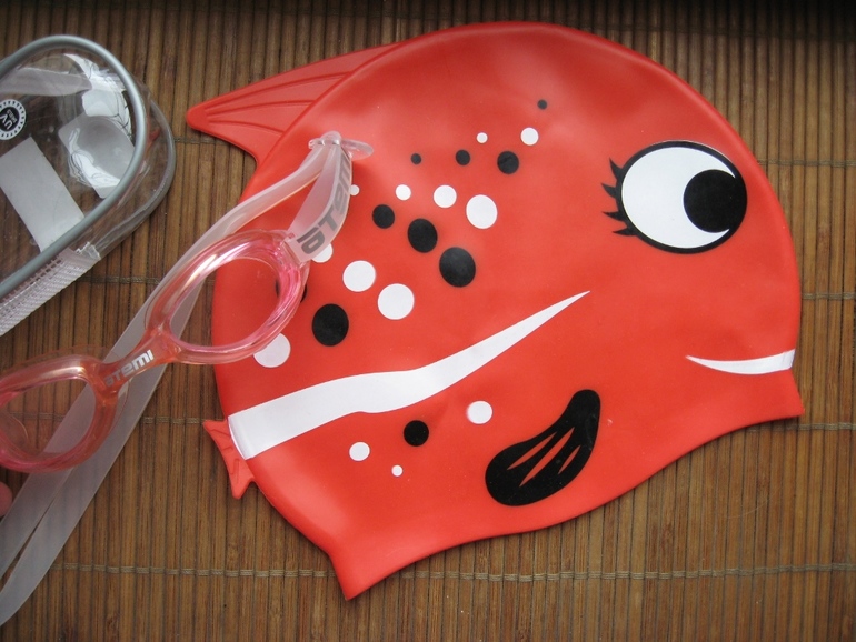Детские принадлежности и игрушки!Красивая шапочка в виде рыбки (довольно плотная), очки с покрытием против запотевания, резинка узкая, сумочка для них - всё вместе 100р