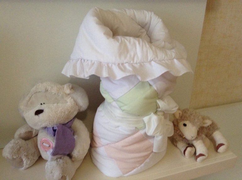 Конверт с одной стороны просто белый, с другой - в розовые и салатовые ромбы. В дальнейшем конверт можно использовать как одеялко в коляску или кроватку.