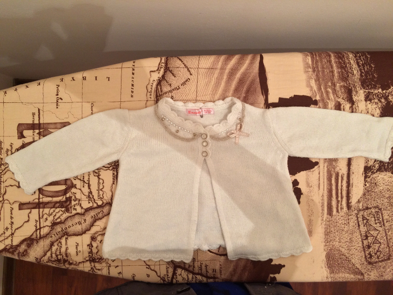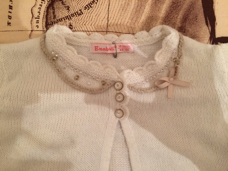 Очень нежная кофточка на рост 86 см. В хорошем состоянии. Все Стразы на месте, кроме одного стразика , с верхней пуговки. Цена 200 р
