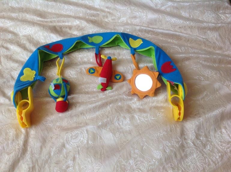 Мягкая дуга способствует развитию моторной активности ребенка, цветовосприятия, координации движения. На дуге три игрушки - воздушный шар (при нажатии музыка), самолетик (как погремушка издает звук), и солнышко (зеркало).