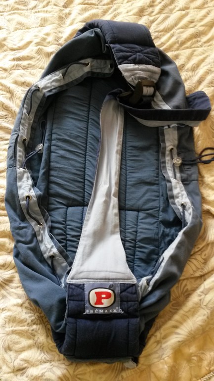 Сумка активно б/у (пользовалась ею, пока ребенок был совсем маленький, потом перешла на кенгуру). В основном, носила его, когда ходили в поликлиннику (туда надо было ехать на автобусе, с коляской неудобно). Покупала ее в Оланте на Севастопольском. Внутри что-то типа встроенного матрасика: