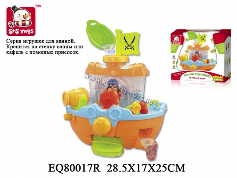 кораблик с брызгалкой для игры в воде, присоски для кафеля, на кораблике есть пушка, флаг, пират, черпачок для воды. У кораблика игрушки для ванной на дне есть колесико, при помощи которого он может плавать в ванной.