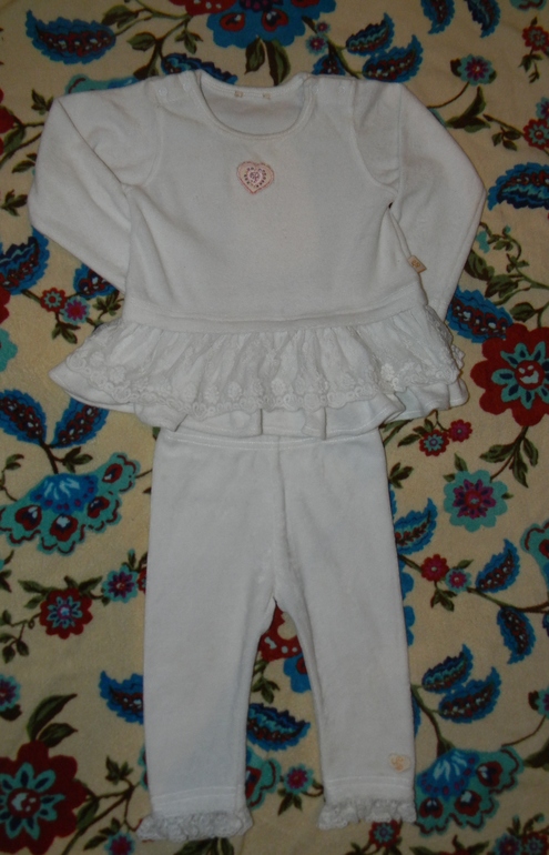 Белый бархатный комплект.Лосины на 6-9мес,туника побольше,до года точно подойдет.За комплект 300руб.