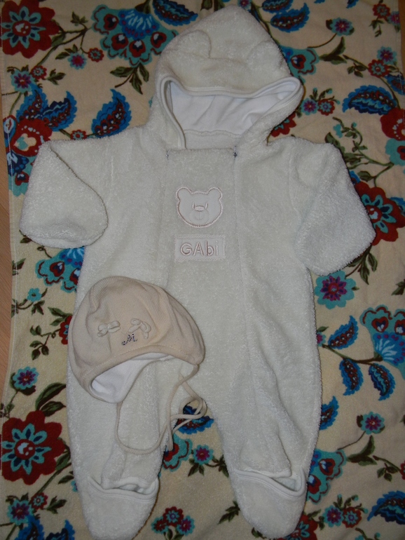 Комбинезон утепленный.Носили до 7 мес.Вместе с шапкой.На шапке стразами буква М.