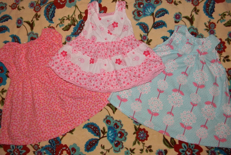Платья.По бокам H&M,тонкий хлопок,очень классно на лето,примерно на 4-7мес.В середине розовое платье неизвестной фирмы,на 2-3мес.100руб любое.