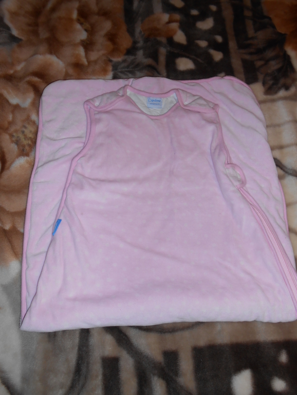 Девочка 0-6 мес.(56-68 см.)обалденный спальный мешок 6-18 месяцев,теплый, розовый в горошек велюр,внутри х/б,с боку молния и кнопка, на лямках кнопки, качество нежное.