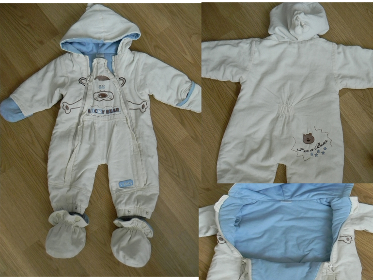 Мальчик 0-6 мес.(56-68 см.)1. Комбез демисезонный V-baby, маркировка 6-12 месяцев, примерно 74 р.. На погоду до 12 градусов где-то, ниже - мой мерз, но если что-то теплое под низ, то ручки теплые были. Пинетки практически к ним не носили, сам комбез в отличном состоянии, пятен нет, рукавчики с отворотами. В принципе, он нам и сейчас в 9 месяцев как раз, но у нас много других вещей, охота и их потаскать:)