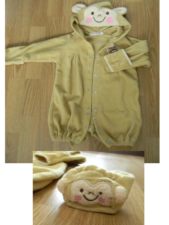 2. Комбез ноу нейм, написано 80р., но он скорее 68р.) Типа флиса, в виде обезьянки. Оч забавно смотрится на малыше, есть пинетки, но они крайне неудобные и резинка к ним тугая. Комбез сделан так, что если "промежность" не сходится, то можно просто застегнуть без "ног". Использовали в качестве накидки на вечер лета или в хмурую погодку. Рукавички с отворотами. носили до 9 месяцев, одевали раз 5-6. Б/у неактивно 150 рублей.