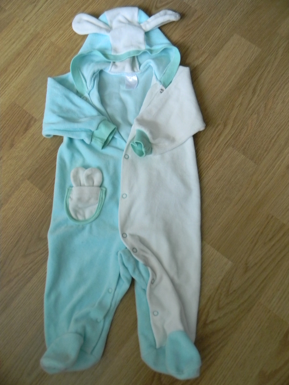 4. ПРОДАНО Слип ноу нейм в виде кролика, 68р.) Тоже милый, но тонкий, хоть и похож на велюр. Одевали пару раз в гости в качестве накидки под бодик. Явно не на пухлого малыша. Носили до 8 месяцев, потом стали слишком длинными:) 150 рублей.