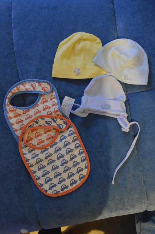 Mothercare слюнявчики по 100 руб, в очень хорошем состоянии. Шапочки 0-3-6 мес по 50 руб.