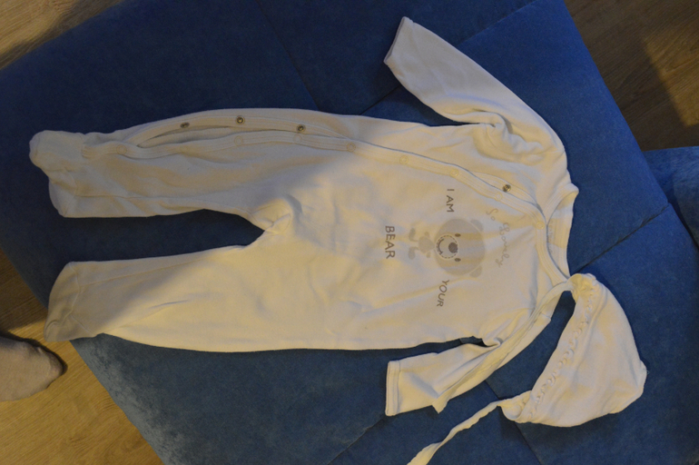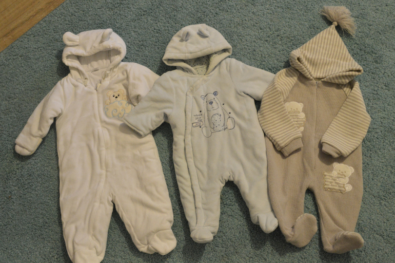 4.Комбинезоны осенние первый 74 6-9 мес 600 руб, 2 Mothercare 0-3 мес 500 руб(есть пятнышко в районе горла,отстирывать не пробовала), 3й вязаный с подкладочкой новый 1-2 раза одели 74 см 600 руб.