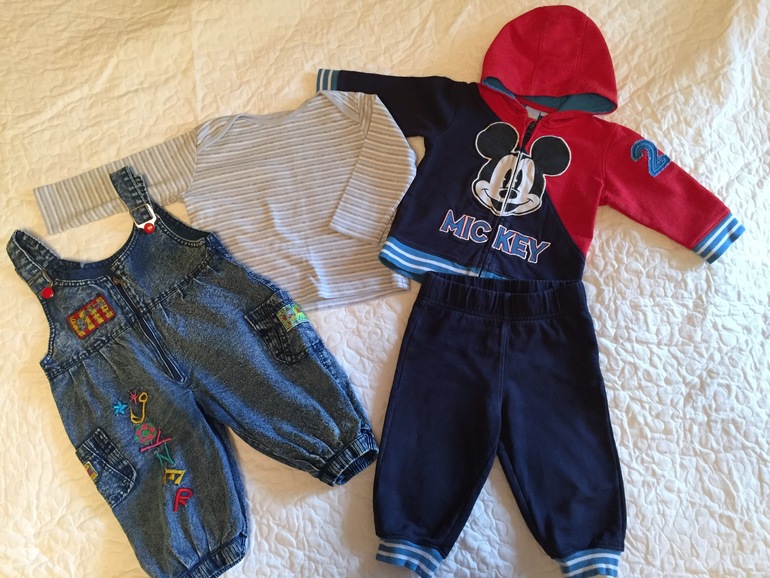Размер 74, джинсовый комбинезон, теплая кофточка в полоску (Next baby), костюмчик (Disney), все за 500 рублей