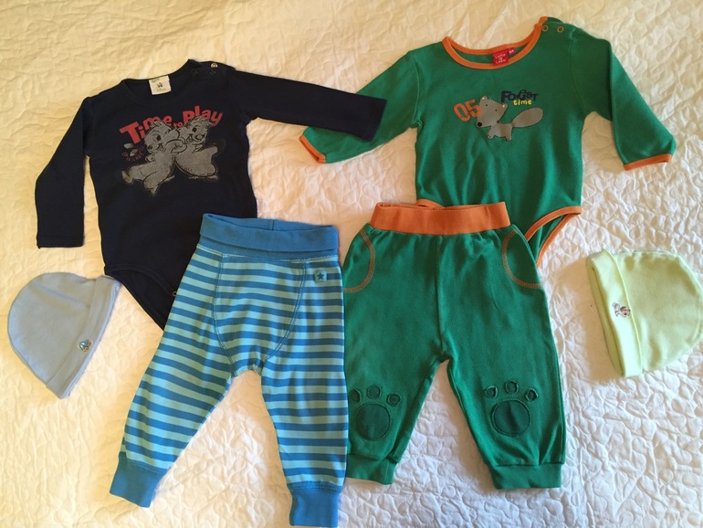 Размер 68, зеленый костюмчик (Lotta&Lassi, финский), синее боди (Benetton baby), полосатые штанишки (Baby by Lindex, маркировка 74, но носили как 68), две шапочки, все за 500 рублей