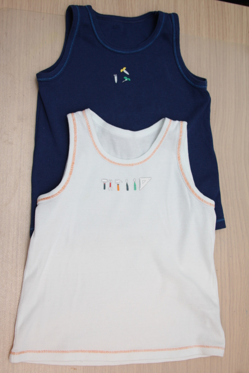 Набор из 2-х маек фирма Mathercare , р-р 1,5-2года, длина по спинке 35 см., Состояние хорошее., пятен, дырок нет. 250 руб.