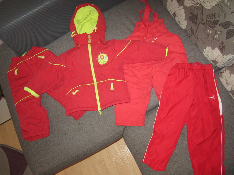 Комтюм д/с Донило 92 (смело до 98), куртка от него+комбинезон - можно с 86, красные штаны где-то на 98, их носили с курткой от костюма, когда было не очень холодно, они без утеплителя, плащевка+подклад