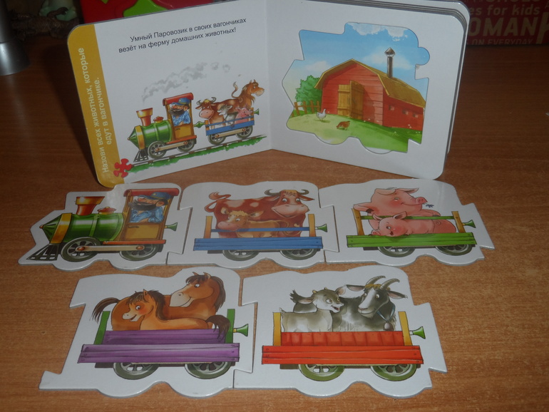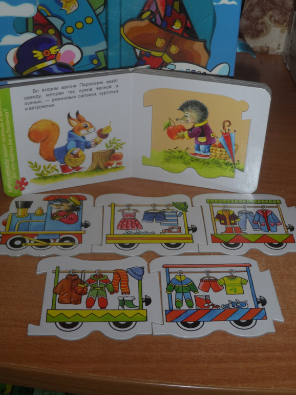 11.) Книжки-паззлы-вкладыши "Умный паровозик". Жёсткий картон. Без повреждений, Хотя в своё время часто играли и сыну нравилось возить поезд по столу : - Чух-чух, ту-ту. Эй , Ёжик , а вот и твоя курточка ! . Обе за 70 руб., ПРОДАНО