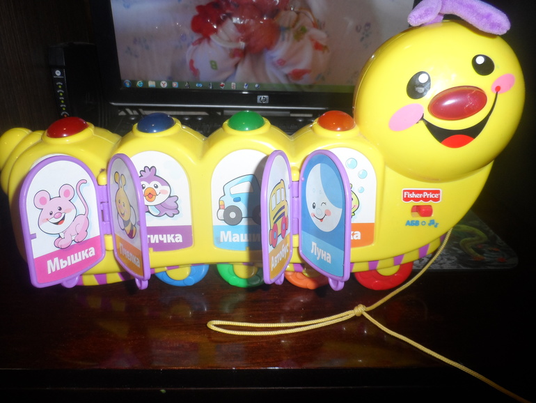 1.) Гусеница на колёсиках , когда тянут за верёвочку немного подпрыгивает. Два режима громкости. Два режима: песни и обучение. В режиме обучение озвучиваются все картинки ( кто на них, какого цвета , что делают) и составление предложений с этими картинками. Во втором режиме 5-ть песенок. Пригодится для ребёнка который уже сидит самостоятельно и может сам нажимать на кнопочки , и листать странички . ПРОДАНА