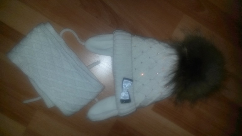 Комплект молочного цвета, шапочка немного маломерит, мне кажется. 48-49см.... Теплющая, одевали в самые сильные морозы. Подкладка флис.Все стразы на месте, шикарный помпон!