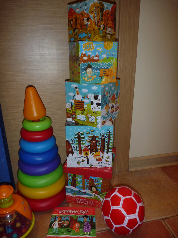 Внутри каждой коробки - брошюра с советами, как проводить занятия, вопросами, которые помогут малышу, а также стихи обо всех временах года. Для детей от 1 до 4 лет. Состояние прекрасное, играли мало, есть аналогичная игрушка, там кубиков больше, тяготеем к ней)