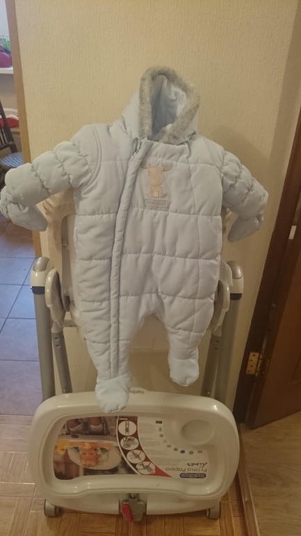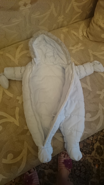 Мальчик 0-6 мес.(56-68 см.)Комбинезон Mother Care в идеальном состоянии,на молнии с капюшоном. Снаружи хб,внутри подкладка хб,наполнитель полиэстер. С варежками.Размер от 0-3 мес.,до 6,5кг. 1000 р.