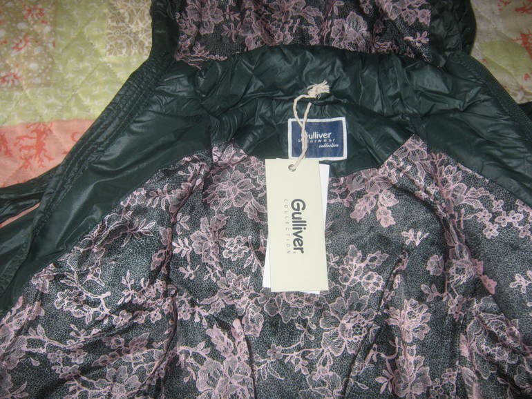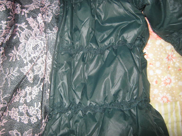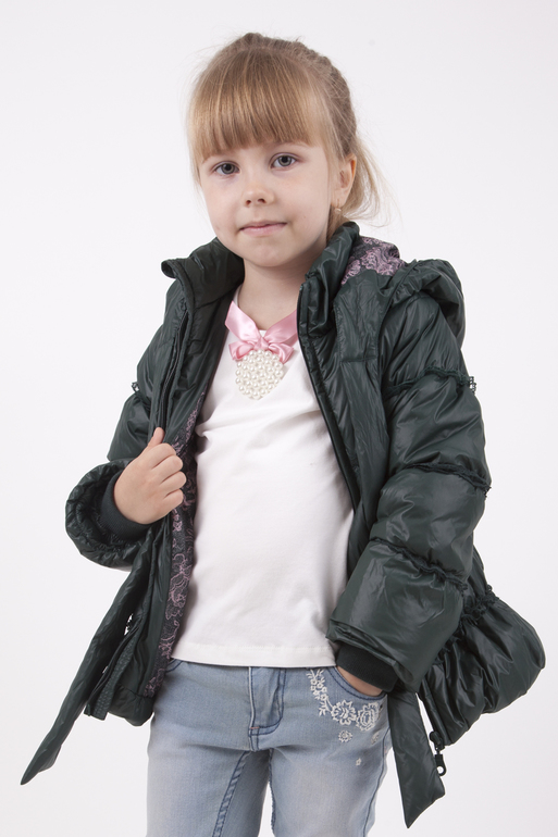 Необычная утепленная куртка Гулливер для девочки темно-зеленого цвета, капюшон завязывается на бант спереди, подкладка с рисунком в виде кружева. Капюшон съемный, строчки на куртке отделаны зеленым кружевом в тон, что придает изделию нарядный вид. Рукава снизу отделаны трикотажной резинкой.