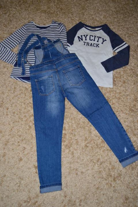 Продам джинсовый комбинезон- в отличном состоянии! Маркировка 128 большемерит до роста 134, лямки регулируются, сбоку застегивается на пуговки. К нему комплектом: 2 лонга некст. Все вещи большемерят до роста 134.Продажа только комплектом- 1400р.