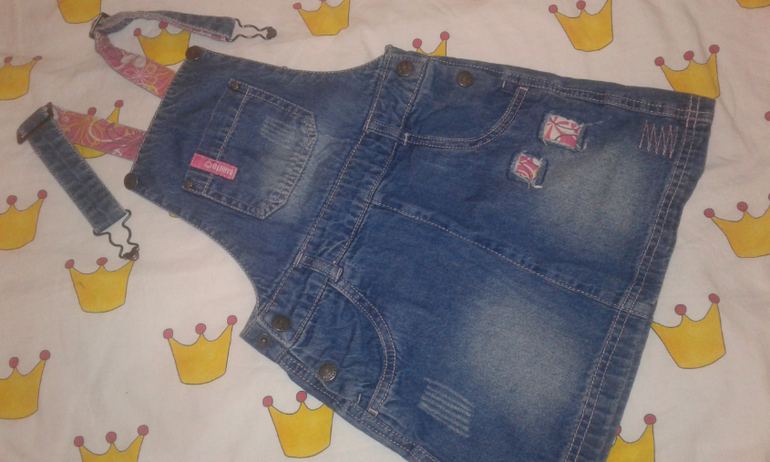 22. Сарафан, 7-8Y р.128 плотный хб, практически джинса. Очень хорошее состояние, но нюанс на спинке маленький, см фото. 250р.