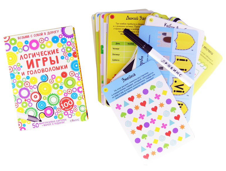 Увлекательный набор «100 занимательных игр в путешествиях» создан специально для маленьких путешественников! В наборе ты найдешь специальные карточки с играми, головоломками, заданиями для развития логики, смекалки и творческого мышления, а также маркер, которым можно рисовать и писать. И не переживай за ошибки, поскольку поверхность карточек обладает стирающимися свойствами. Ты можешь играть и рисовать снова и снова! Играй и развивайся! Возьми с собой набор в дорогу. Кстати, если тебе захочется рисовать разноцветными маркерами, не стесняйся, для этих карточек подходит любой фломастер.