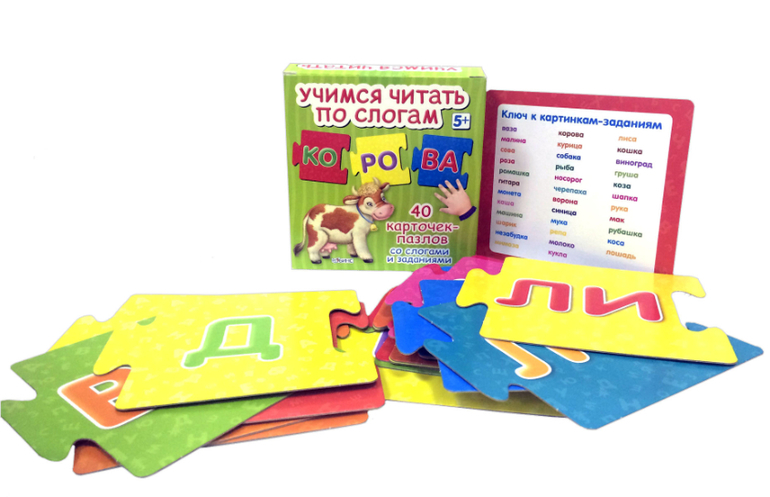 Слоговая система обучения чтению ребенка, развивающие карточки и пазлы. «Учимся читать по слогам» - это обучающая и развивающая игра, с помощью которой ваш ребенок научится читать и складывать слова самостоятельно. Игра с карточками рассчитана на детей, которые уже знают алфавит и имеют минимальные навыки чтения по слогам. В наборе вы найдете 40 двусторонних карточек. С одной стороны приводится картинка-слово, с другой - какой-либо слог. Ребенок называет картинку-слово, а потом ищет среди карточек-слогов необходимые слоги, чтобы составить слово, изображенное на картинке. Пока ребенок ищет необходимые слоги, он произносит вслух слоги и на других карточках, таким образом запоминая дополнительны буквы и слоги. Когда все слоги найдены, попросите малыша прочитать слово целиком. Картинки-задания приводятся по принципу от простого к сложному, начиная от простых односложных слов (например, слово «мак»), заканчивая многосложными трудными словами (например, «незабудка», «виноград», «черепаха»). Все карточки сделаны из толстого картона в форме пазлов и подходят друг к другу. Слоги и отдельные буквы приводятся на ярком фоне, а иллюстрации даются на белом, так чтобы не отвлекать внимание ребенка.