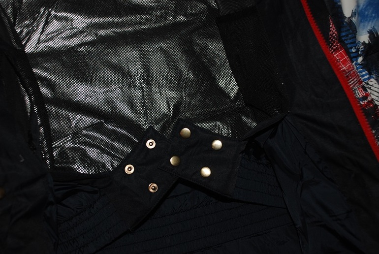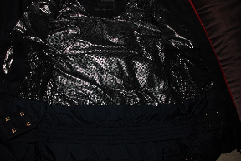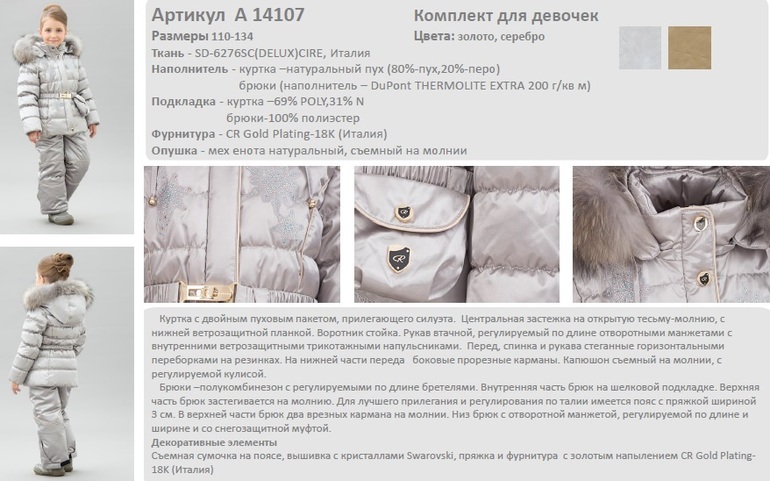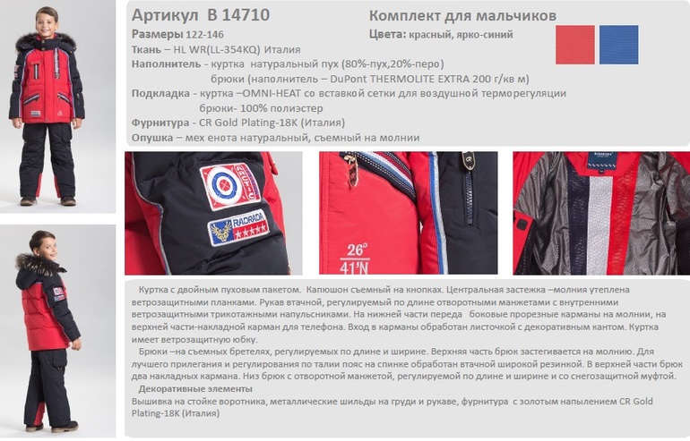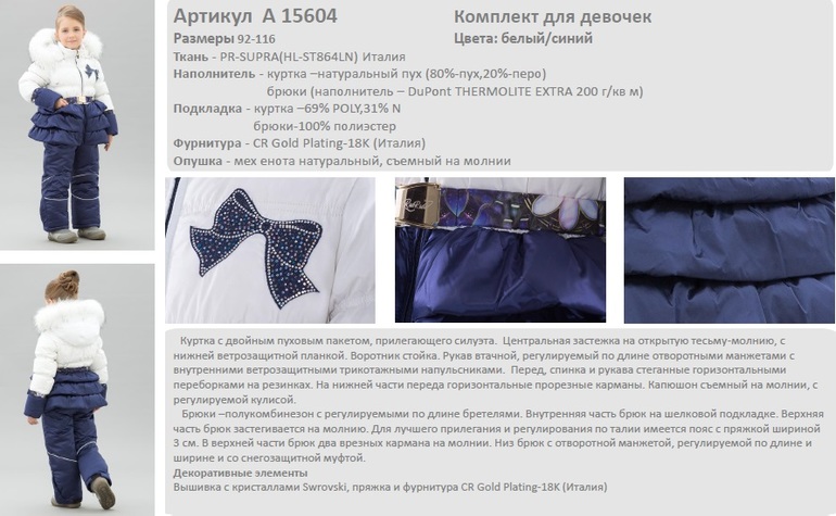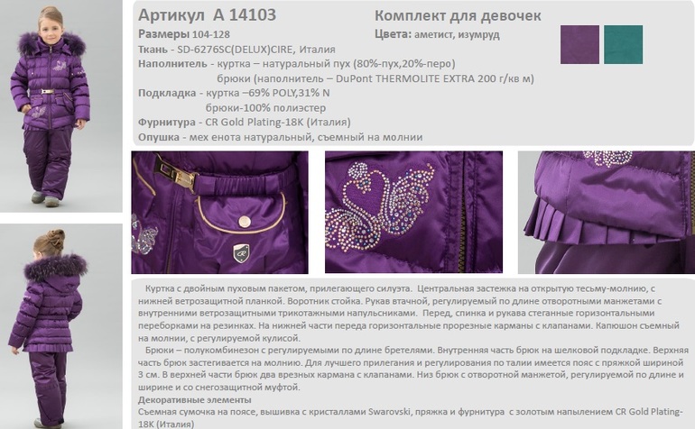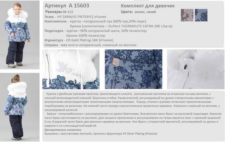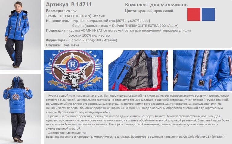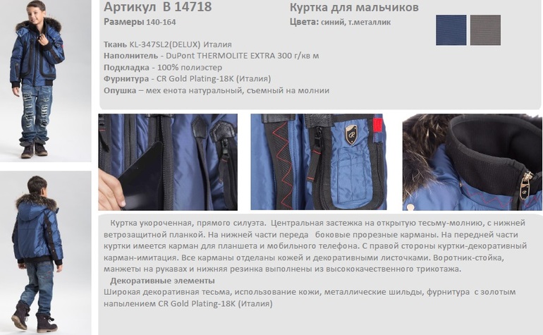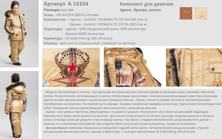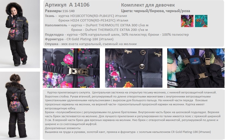 Куртка с двойным пуховым пакетом, прилегающего силуэта. Центральная застежка на открытую тесьму-молнию, с нижнейветрозащитной планкой. Воротник стойка. Рукав втачной, регулируемыйпо длине отворотными манжетами с внутренними ветрозащитнымитрикотажными напульсниками. Перед, спинка и рукава стеганныегоризонтальными переборками на резинках. На нижней части передагоризонтальные прорезные карманы с клапанами. Капюшон съемныйна молнии, с регулируемой кулисой.