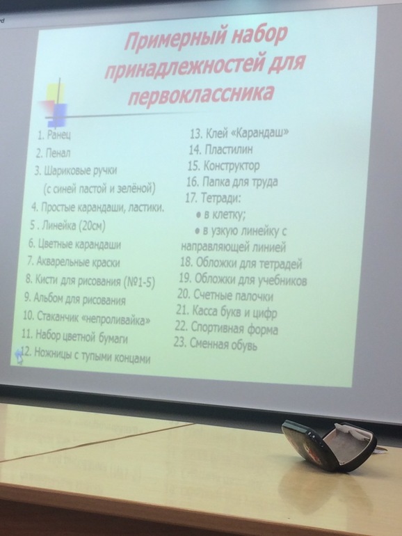 Нам давали не примерный список, как ниже, а вполне конкретный: скажем, ручки для письма только синие Stabilo Left/Right (они для постановки пальцев, отдельно для правшей и левшей); точилки только закрытого типа; линейка непрозрачная без двойной шкалы; пенал только мягкий (типа косметички); пластилин и гуашь НЕ "Гамма" (вот "Луч" какой-нибудь - норм, а "Гамма" нее..); цв.карандаши деревянные или механические (гибкие пластиковые - нее), цв. бумага плотная основных цветов без глянца и блесток, ну и т.д. Сейчас проблем нет купить, нам основной список вообще только 1 сентября выдали после линейки, мы заехали в Ашан и купили всё.