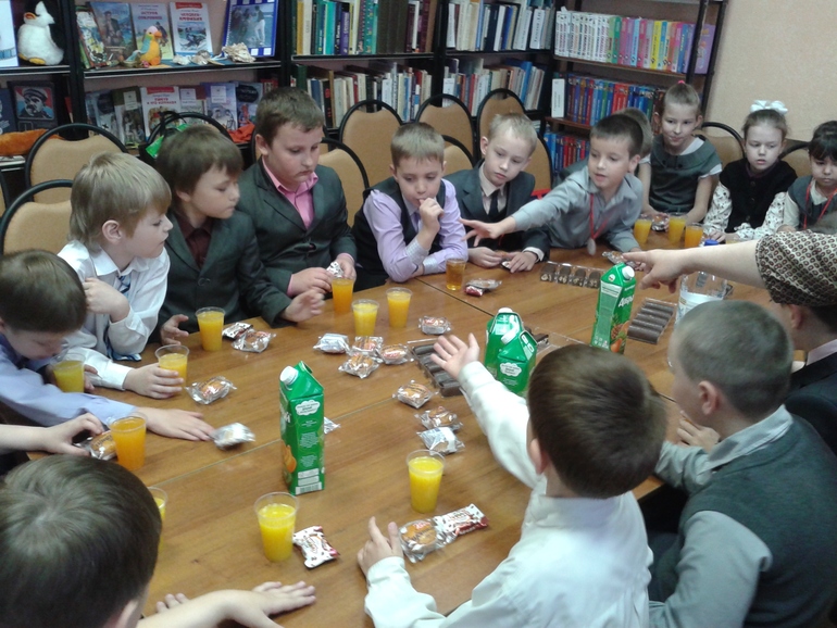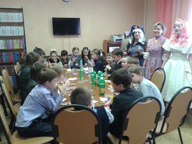 На этот раз нас встречали фея и баба Яга, дети пели песни, отгадывали загадки, им читали рассказы, рекламировали разные книжки. Для меня это, конечно, диковато как-то - разодетые библиотекарши уговаривают первоклассников взять у них книжку почитать. Более того. У нас там еще и чаепитие было! Ну да, родительский комитет покупал еду и приносил, но ведь в БИБЛИОТЕКУ!!! Я бы такое только в каком-то комичном сне могла бы представить, а уж никак не наяву.