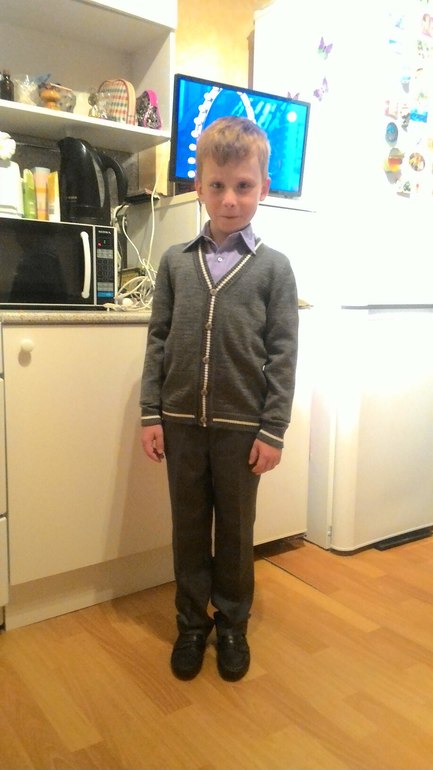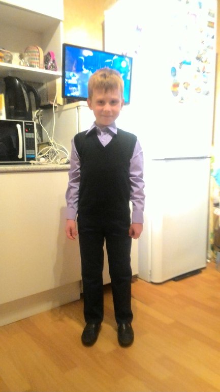 Костюм покупали в Шалунах, жилет и пуловер заказывала в совместных закупках " Фемина,рубашки в Детском мире.