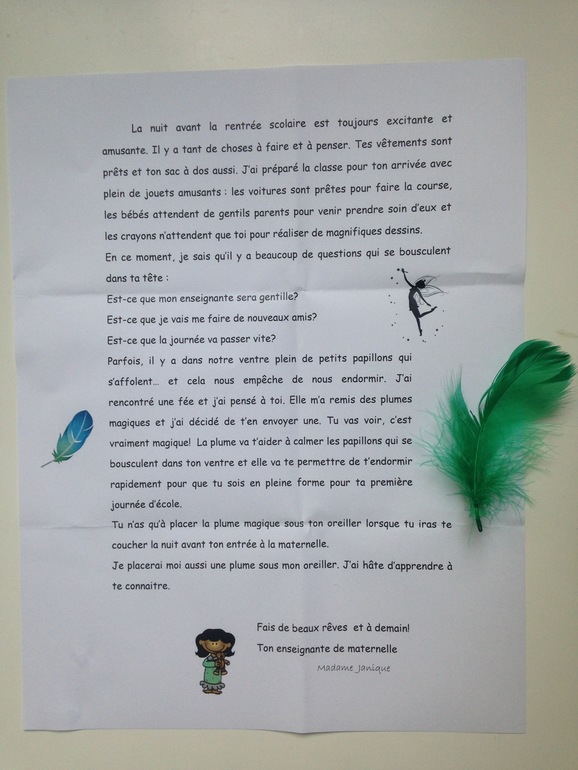 Иногда в нашем животе от волнения порхают бабочки... и это не дает нам заснуть. Я встретила фею и подумала о тебе. Она дала мне волшебные перышки, и я решила послать тебе одно. Ты увидишь, оно на самом деле волшебное! Перышко поможет тебе успокоить бабочек в животе и быстро заснуть, так что назавтра ты будешь чувствовать себя хорошо в первый школьный день.