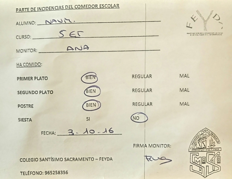 в обед перерыв - сиеста с 12:30 до 15, в это время дети обедают в столовой (comedor), посещают кружки (у нас дзюдо judo и танцы danza) и просто гоняются по площадке под присмотром "монитора" - одной из воспитательниц.